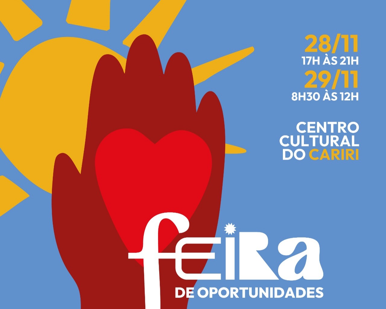 O Governo do Ceará promove, nos dias 28 e 29 de novembro, no Centro Cultural do Cariri, no Crato, a 1ª Feira de Oportunidades Ceará Sem Fome – Edição Cariri e Centro-Sul, primeira iniciativa desse formato dentro do programa. A ação conta com a parceria da Secretaria do Trabalho e do Sebrae/CE e busca dar visibilidade ao trabalho desenvolvido pelos beneficiários, incentivar a geração de renda, ampliar oportunidades de negócios e fortalecer o empreendedorismo entre aqueles que avançaram nos cursos de qualificação, trilhas formativas e mentorias.